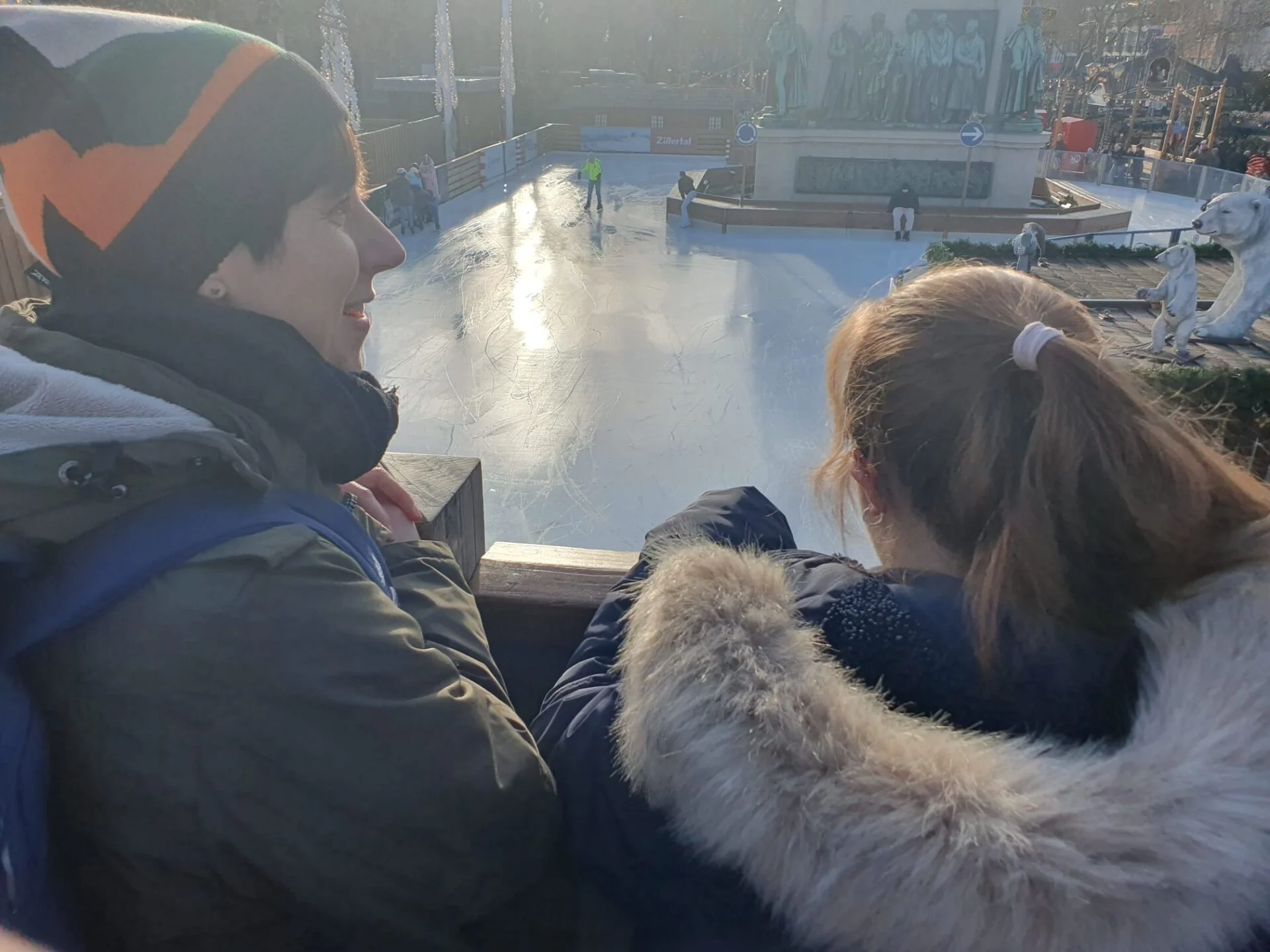 Zuerst wird die Eisfläche am Heumarkt bestaunt. Danach geht es zum Alter Markt für eine Fahrt mit dem (kleinen) Riesenrad. Es gefällt uns, die vielen schönen Buden anzuschauen und die vielen Düfte zu riechen.